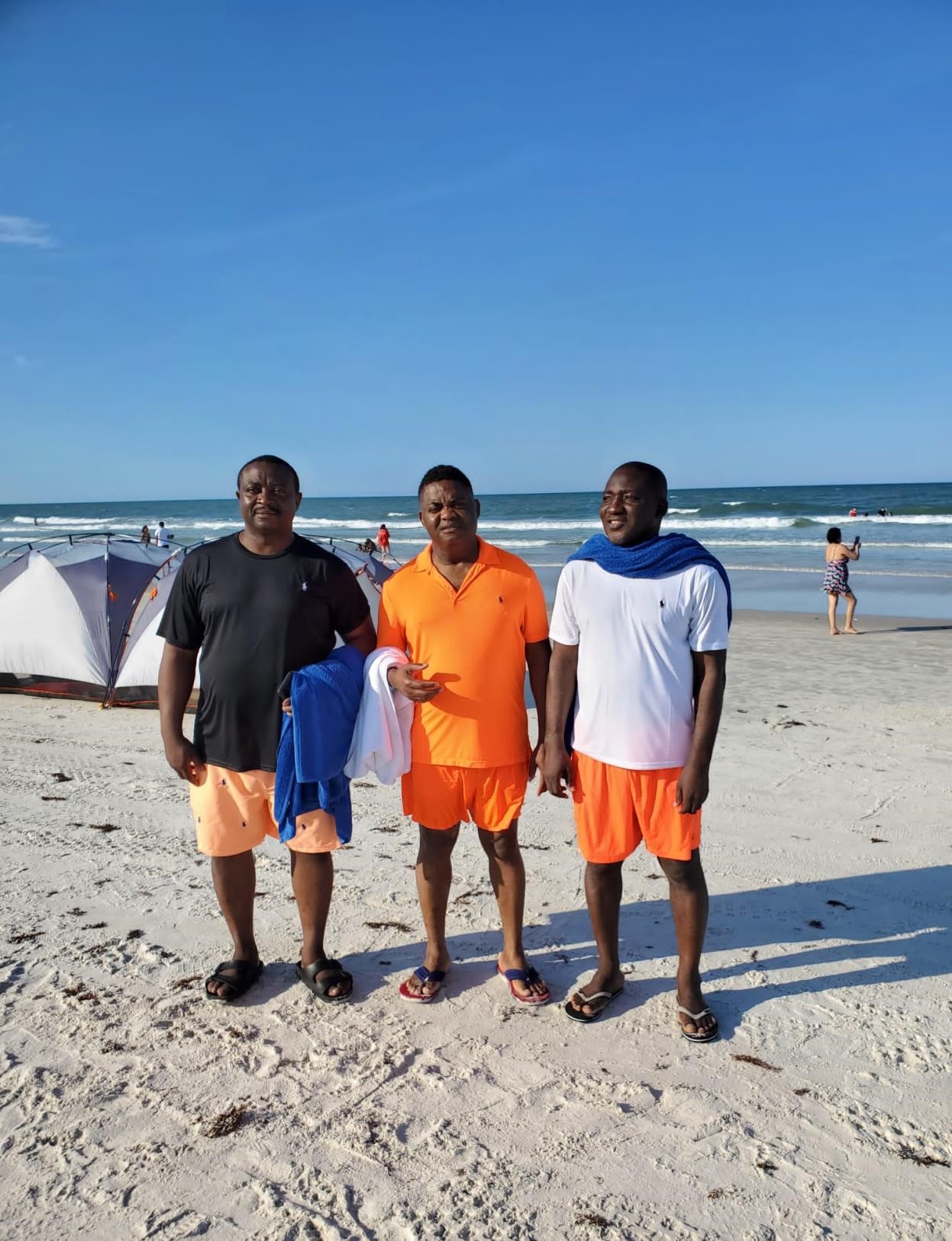 BRIGADIER GENERAL ISA, MR. CHUKU AND AIR COMMODORE USMAN POSE FOR A PICTURE AFTER SWIMMING AT THE WORLD’S MOST FAMOUS BEACH, DAYTONA BEACH.